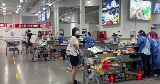 在閔行北部,位于華漕鎮的開市客也已恢復線下營業,實行限時、限流管理。分時段進場,控制進場人數,并在每個時間段后安排清場、消殺及補貨。不少毗鄰超市的居民限時有序出行。入口處放置了環形隔欄,顧客有序驗核臨時出入證、掃場所碼和數字哨兵,進行手部消毒后入場。每位顧客結完賬,收銀處放置物品的傳輸帶還會消殺一次。一批顧客選購完畢后,工作人員會進行一輪消殺,再放行下一批顧客,整體現場秩序良好。