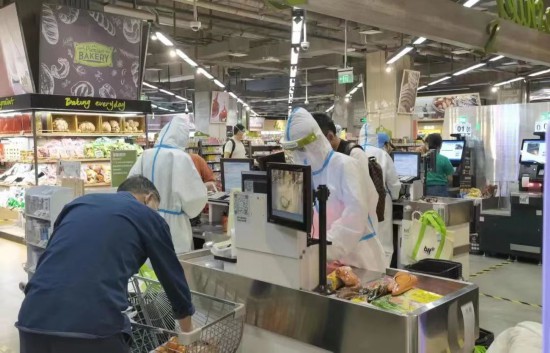 前幾天,位于仲盛世界商城地下B1層的家樂福莘莊店也迎來了恢復線下營業的首批顧客。超市目前僅向特定顧客“分時段、分批次”開放!熬用癖仨氁獞{‘三證’才能進來的,第一是核酸陰性證明,第二是居委會開的出門證明,第三是由我們家樂福出具的邀請卡,有了‘三證’才能進入,讓每一個進來的人都放心購物”。家樂福莘莊店店長潘敏潔介紹,目前分上午、下午兩個時段開放營業,客流保持在300人左右。