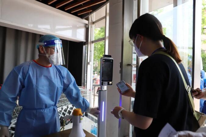 步入超市,一道道關卡都有專門“大白”值守!按蠹易⒁鈨擅拙,保持好安全距離!痹缕峙沙鏊嗄昝窬鄤P,是一名安扎在華聯吉買盛超市的“大白”。當有居民在購物付款時遇到困難,他會第一時間介入幫忙。