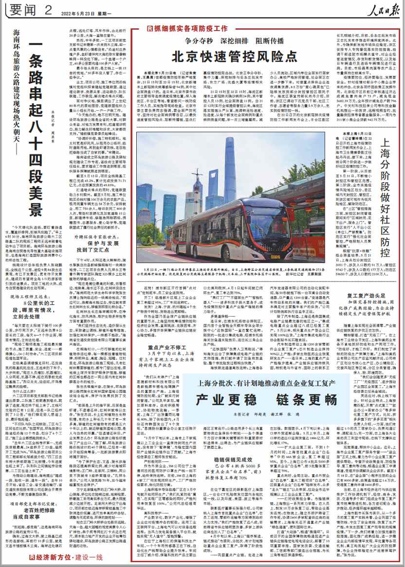 《人民日報》5月23日第二版消息,汽車制造帶動上海1200余家零部件企業復工復產;芯片制造企業保持90%以上產能;多家生物醫藥企業恢復研發生產……連日來,上海的重點產業產能穩步提高,產業鏈供應鏈持續鞏固,特別是與外省市、國際上的聯系正在加強。數據顯示,4月下旬以來,上?诎锻赓Q逐漸企穩。