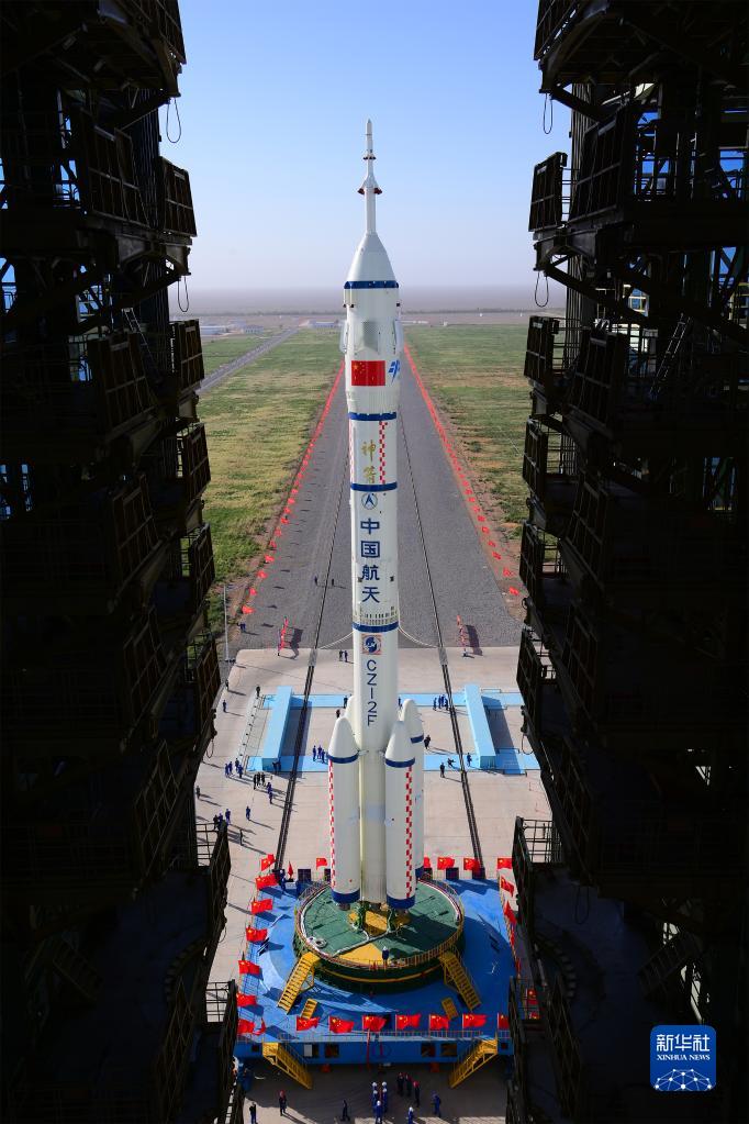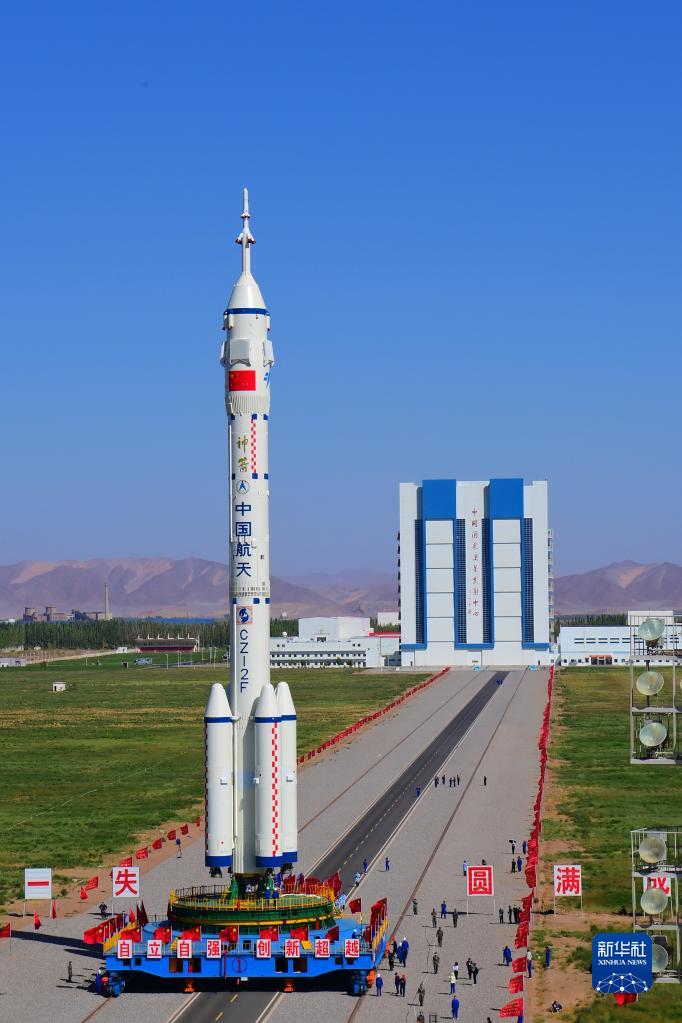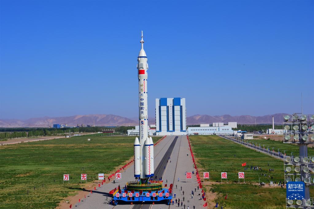 5月29日,神舟十四號載人飛船與長征二號F遙十四運載火箭組合體轉至發射區。新華社發(汪江波 攝)