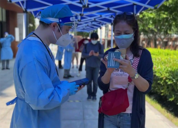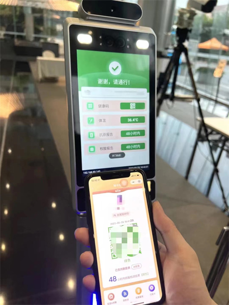 “市民只需正對著立式‘數字哨兵’,并將隨申碼放置掃描處,即可顯示出其體溫、健康碼、抗原和核酸檢測結果!苯鸷鐦驀H中心物業總經理吳鳴先告訴記者,相較以往需依次出示多種健康證明,既費時又麻煩,啟用“數字哨兵”后安全方便了不少。首先就是健康核驗的時間縮短,從站定掃碼到顯示結果不過幾秒鐘,大大提升通行效率;其次操作也更加簡單,掃一碼就可獲取多種信息;最后就是可以確保查驗期間人與人之間的安全距離,工作人員和通行人員無需近距離共同查看手機上的信息,可分別從手機和“數字哨兵”屏幕讀取,如遇健康信息異常則會進行語音提示,方便工作人員及時進行應急處置。