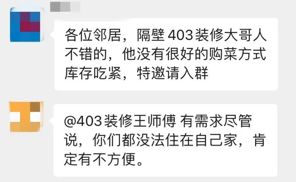 “之前忙著裝修,有時會在業主房子里休息下,生活用品還算齊全。但是買吃的成了個大問題!蓖鯉煾蹈嬖V記者,封控初期,由于網購很難買到,又不知道如何參加小區團購,他心中難免有些慌亂!昂迷诰游瘯鸵恍┚用窳私獾搅宋业那闆r,及時把我拉進了居民微信群里!边M群之后,小區的居民們都十分關心王師傅,讓他有需求盡管說。有的居民給王師傅送來了大米,有的居民給王師傅送來了蔬菜,有的則送了調味料……大家每次團購的時候,也不忘提醒王師傅?紤]到王師傅住的房子沒有冰箱,鄰居們還貼心地幫他將居委會發放的愛心物資儲存在自家冰箱里,等需要時再取用。