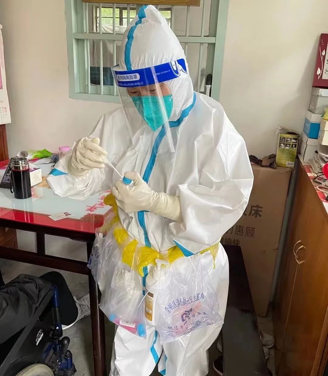 穿上防護服、戴好口罩和防護面罩,撕開棉簽、采集咽拭子、放入試管、酒精消毒……這樣的標準化流程,她已經重復了無數次,動作嫻熟而又嚴謹。她或俯身低腰、或翹起腳尖,根據采樣村民的狀態,不斷地調整著自己的姿勢,在她的指導下,不少村民減少了采樣的不適和恐懼感。