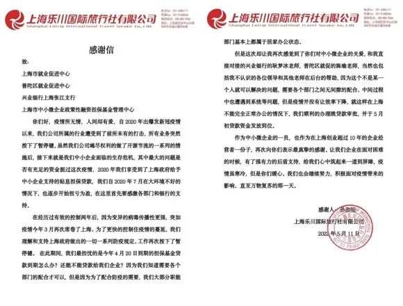 “感受到了你們對小微企業的關愛,我們能順利地辦理完貸款審批,并收到發放的貸款資金,真是太感謝了!苯,普陀區就業促進中心收到一封來自上海樂川國際旅行社有限公司法人代表孫勁松發來的感謝信。