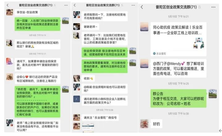 直播結束后,不少企業還加入了微信社群,繼續討論并咨詢創業相關話題,包括貸款流程、房租補貼、線上培訓平臺等內容。區就促中心工作人員一一進行答復,群內的創業者不禁感嘆,“普陀區創業服務做得真不錯!”