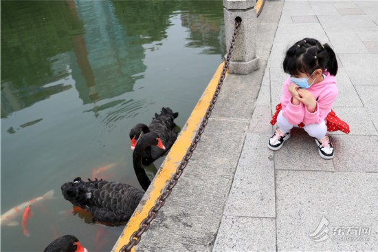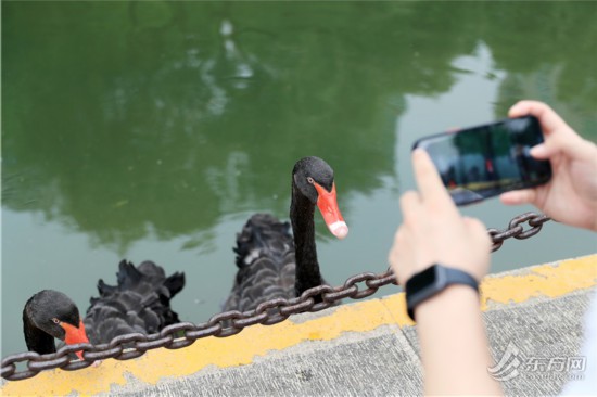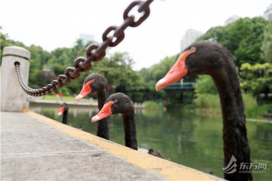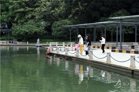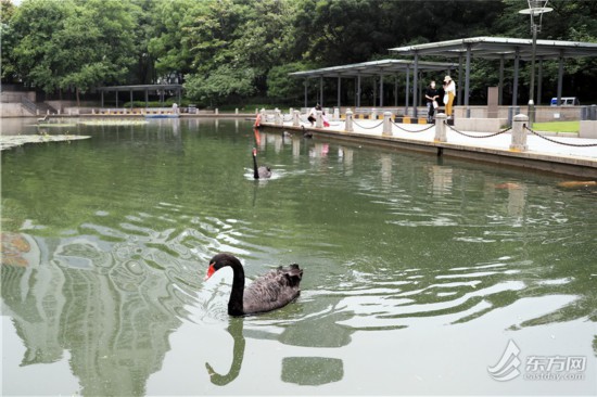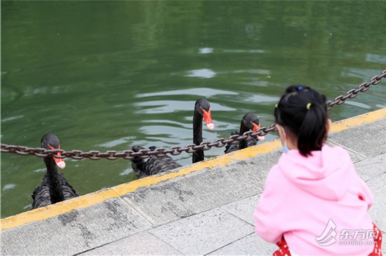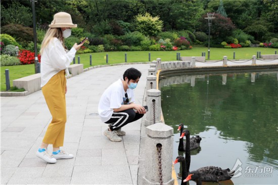 5月30日下午,悶熱的申城有了初夏的感覺,但一步入徐家匯公園頓感清涼。一位帶著小女孩前來游園的市民說:“疫情宅家這么久,今天終于可以來逛一逛公園,欣賞一下美景!毙∨R金湖里的四只黑天鵝充滿興趣,也許是太久沒見到游客了,黑天鵝也十分熱情,紛紛主動靠岸與游客互動。
