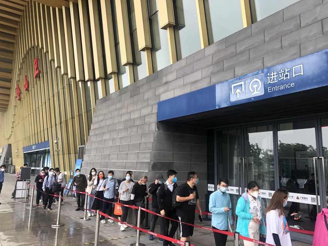 為了保證現場的秩序,金山衛站的出站口、進站口以及閘機等都安排了工作人員進行引導。每一位站內工作人員都需要戴好口罩、面屏以及手套。