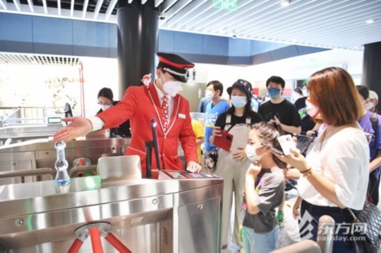 9:45分,東方明珠1號門門口已經排起了長隊,不少市民在重新開放首日前來體驗。據介紹,入園時,市民、游客須規范佩戴口罩,自覺接受體溫檢測,并出示72小時內核酸檢測陰性的隨申碼、無途經中高風險地區的行程卡、東方明珠塔“預約通行碼”,通過景區“數字哨兵”驗證或主動掃場所碼查驗通過后入園。
