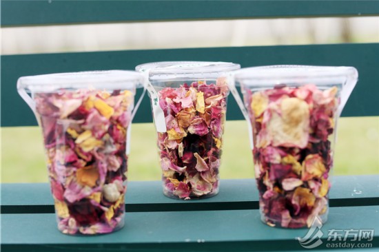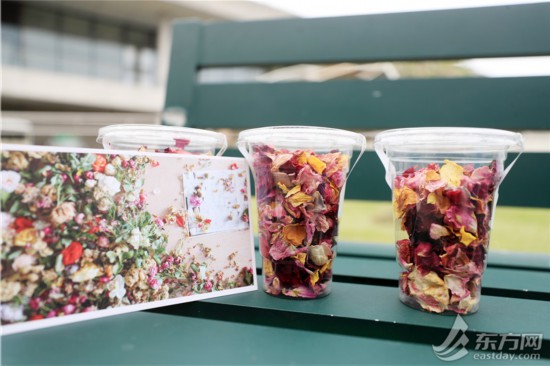 花瓣是對愛的禮贊,辰山植物園20天前開始計劃和安排,15天前開始采集第一批月季花瓣,8天前第一批花瓣晾干并加工。5天前,辰山植物園為收集盛放花瓣的容器八方求助,三天前落實了印刷卡片和花瓣容器,原本它是一只裝外帶冰咖啡的杯子。在5月27日的上海,找到1500只帶蓋的杯子并非易事。做成1500份開園禮物,就這樣誕生了。