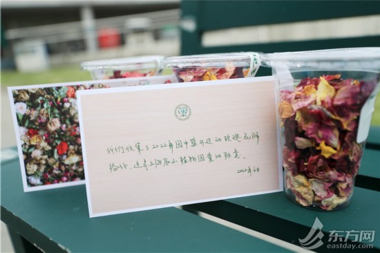辰山植物園也精心準備了一份特殊的禮物:一杯干花花瓣和一張感恩卡片,卡片上寫道:“我們收集了2022年園中盛開過的玫瑰花瓣,這是上海辰山植物園愛的致意。”據介紹,這是辰山植物園園長胡永紅博士和文化園長陳丹燕在大約20天前發起倡議,為游客留住辰山的春天。