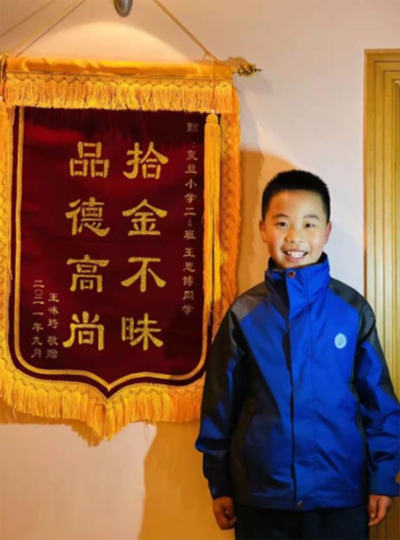 2021年9月18日的下午,王思博同學在小區的共享單車上,撿到了一臺蘋果筆記本電腦,原地等待一個多小時不見失主后撥打110報警。由于正值晚高峰,他又等了一個多小時。9月27日,失主來到復旦小學,給他送來了一面錦旗,上寫著:“拾金不昧,品德高尚”。他卻認為這面錦旗不僅僅屬于他一個人,而是屬于復旦小學的每一個人,他說:“媽媽和我說過,我們每個人在社會上的一言一行,不僅僅代表我們個人,它代表的是身后集體的形象!