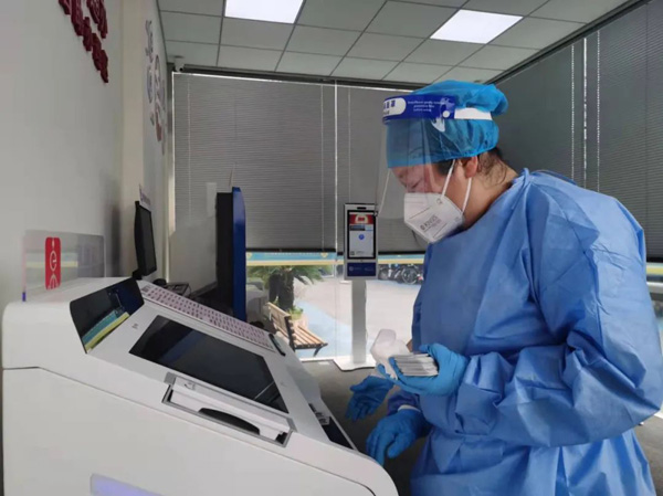 9點不到,市民被允許有序進入銀行網點。出示隨申碼、掃描“數字哨兵”、出示48小時內核酸陰性證明、測量體溫……經過一系列防疫措施后,市民才能進入營業大廳辦理業務。