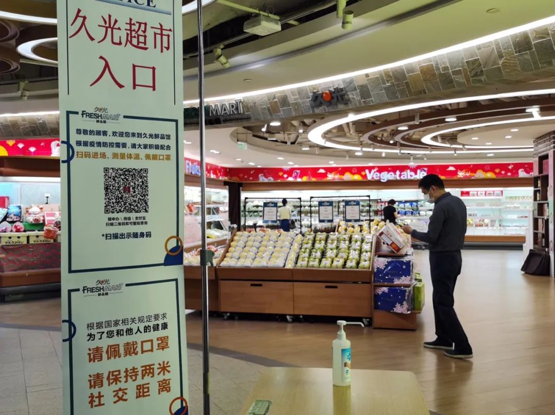 復工首日,新錦華公司聯華超市程橋店正式恢復線下營業,吸引了不少附近居民前來采購。超市入口處,居民們佩戴口罩,自覺拉開間隔,通過數字哨兵掃描健康碼,由工作人員查驗72小時核酸檢測報告等相關信息后,便可入內。