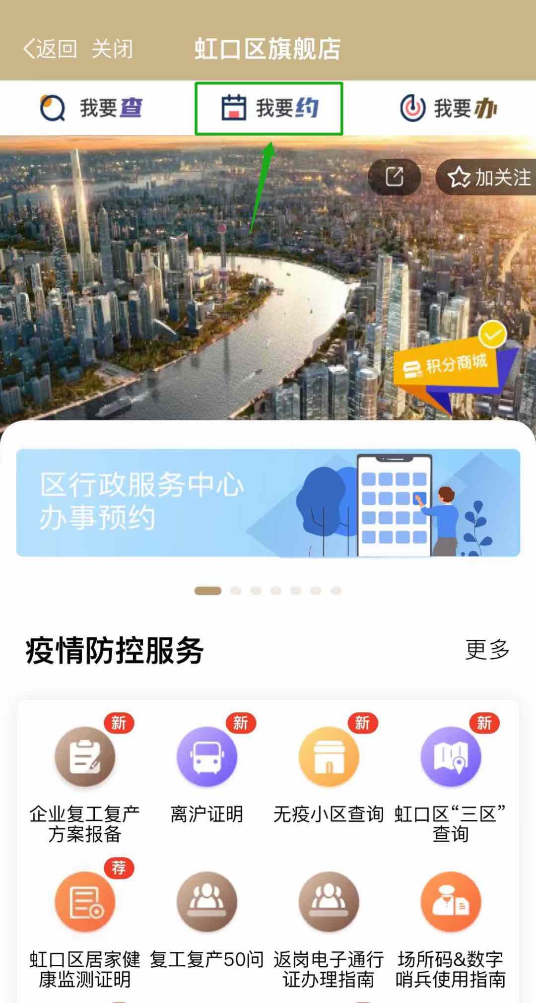 在隨申辦市民云APP,進入虹口區旗艦店,點擊我要約,即可預約所需辦理的業務。