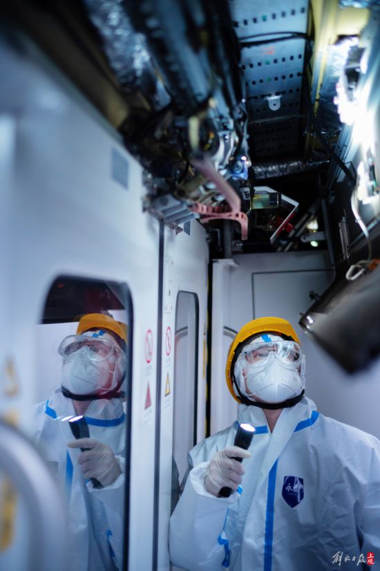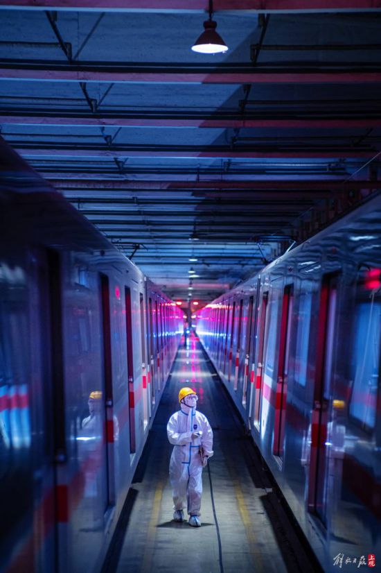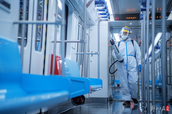 車輛檢查完成后,地鐵物業公司的清潔人員對地鐵車廂進行全方位的擦拭清潔,保證列車以潔凈狀態投入運營。疫情閉環管理期間,清潔人員定期會對所有車廂進行環境清潔。