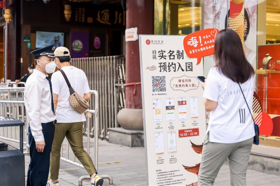 記者在2號門入口看到,排隊市民在工作人員的指導下掃描場所碼,進行實名制登記后,出示72小時核酸陰性報告、預約碼或隨申碼、測體溫有序入園。進入園中,商家們亮燈如初,貨架上擺滿了貨品,顧客們掃描場所碼后進店自由挑選。
