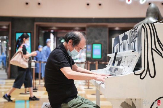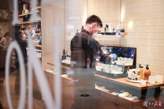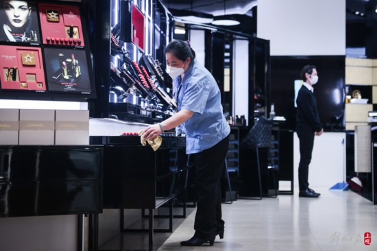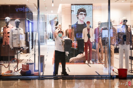 商鋪工作人員提前進入店鋪內做好保潔和準備工作,迎接十點開始進入商場的顧客。