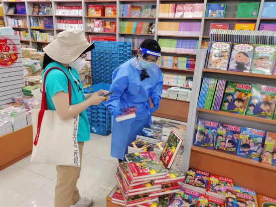 書店每日對環境實施消殺,比如上海書城九六廣場店每日消殺不少于2次;對進店讀者實施限流限距,同一時間進店讀者不超過20人,收銀臺區域設“兩米線”,并時刻提醒讀者保持安全距離。