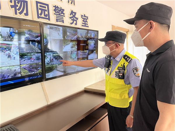 此外,由于防疫要求如蝴蝶館這類的室內場館暫不開放。園區警務室民警利用監控,依托大客流監測系統實時掌握并通報園內人流情況,并加強對戶外的老虎、熊貓等熱門動物的戶外場館的監控。一旦出現人員擁堵聚集的情況就及時加派警力進行疏導,確保人流有序流動,安全可控。而派出所綜合指揮室也同步加強動物圓周邊區域的視頻巡邏,確保園區內外運行平穩有序。