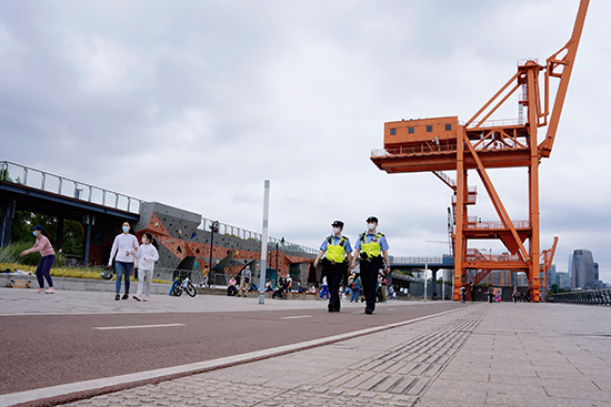 而在徐匯濱江的親水平臺、滑板公園、龍美術館、油罐藝術中心周邊,伴隨著陣陣江風,市民出游興致高漲,隨處可見外出健身、休閑的大人和孩子們。西岸治安派出所綜合指揮室實時觀測人流預警信息,并派警力在沿線開展巡邏,提醒游人注意保持安全距離,規范佩戴口罩,確保隨身物品安全。隨著傍晚臨近,迎來了一波大客流,警方會同保安人員及時前往龍騰大道親水平臺疏散人員,防止意外的發生。截至6月3日17時許,徐匯濱江區域當日累計客流量達8萬余人次,較以往假期有不小的增幅。