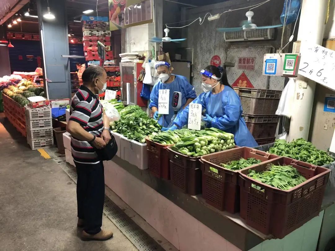 目前,各恢復營業的農貿市場按照相關要求,從業人員均需身穿隔離服、佩戴防護口罩、面屏與手套“四件套”上崗,并在場所入口設置“場所碼”或“數字哨兵”,引導市民掃碼入場。同時每日做好場所清潔消毒,一天至少兩次對營業場所、公共區域與辦公場所進行全方位消毒作業。