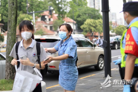 現場參與護校的江蘇路派出所民警則與校方工作人員一同對學生進行疫情防控的提醒,提示學生戴好口罩,提前打開健康碼,在數字哨兵前保持安全距離、不扎堆聚集。同時民警還準備了備用口罩和消毒用品以備不時之需。