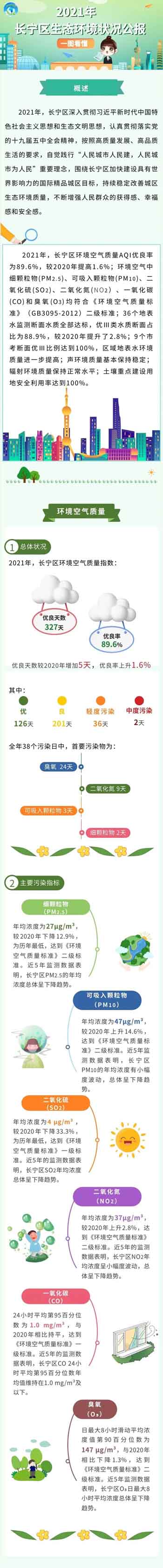 《公報》顯示,2021年,長寧區環境空氣質量AQI優良率為89.6%,較2020年上升1.6%;環境空氣質量優良天數為327天,較2020年增加5天,其中,優126天、良201天;輕度污染36天、中度污染2天,無重度和嚴重污染。