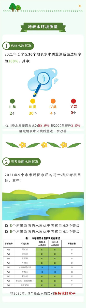 2021年長寧區36個地表水監測斷面水質全部達標,其中,2個斷面符合Ⅱ類水質,30個斷面符合Ⅲ類水質,4個斷面符合Ⅳ類水質,沒有V類水質斷面;優Ⅲ類水質斷面占比為88.9%,較2020年提升2.8%;9個市考斷面優Ⅲ比例達到100%,區域地表水環境質量進一步改善。