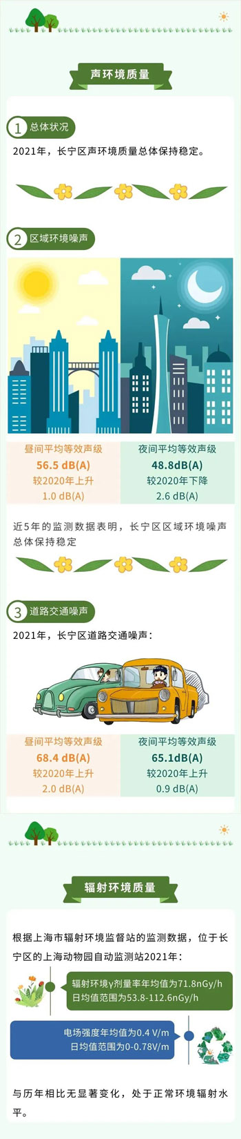 此外,2021年,長寧區聲環境質量基本保持穩定;輻射環境質量保持正常水平;區重點建設用地安全利用率為100%。
