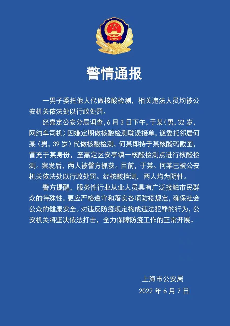 經嘉定公安分局調查,6月3日下午,于某(男,32歲,網約車司機)因嫌定期做核酸檢測耽誤接單,遂委托鄰居何某(男,39歲)代做核酸檢測。何某即持于某核酸碼截圖,冒充于某身份,至嘉定區安亭鎮一核酸檢測點進行核酸檢測。案發后,兩人被警方抓獲。目前,于某、何某已被公安機關依法處以行政處罰。經核酸檢測,兩人均為陰性。