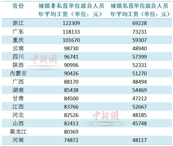 在這15個省份中,浙江、廣東、重慶的城鎮非私營單位就業人員年平均工資超過10萬元大關。