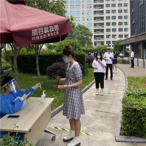 當天上午10時,園區的中央花園中排起了一條核酸檢測的隊伍。為了配合72小時核酸報告的有效性,同時進行例行個人健康監測,一些前來復工的員工自覺來到花園參與核酸檢測。