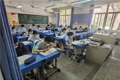 “在校內,學生始終要規范佩戴口罩,對學生的個人衛生要求也比較高,隨時通風、勤洗手,學校也準備了充足的酒精棉、固體酒精等防疫物資。包括每個學生的行動軌跡,我們也是閉環管理,吃飯現在是在教室里吃,食堂會把飯送到教室門口,然后同學同向、不交叉自己用餐,一天三餐都是如此。學生做核酸就是下午三點,做好后學生就可以回家了,住宿的學生就回宿舍了?!蓖趺艚榻B道。