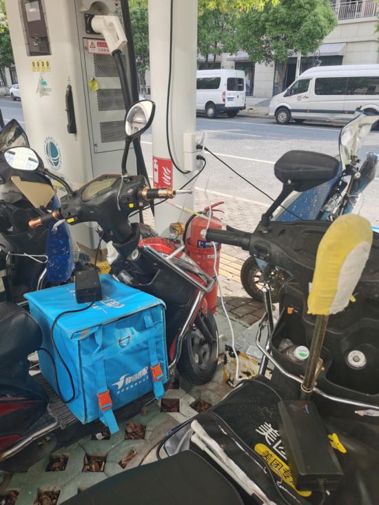 驛站設有專門停放區域,供小哥隨時為電瓶車充電,同時為確保消防安全,夜間十二點會拉閘并開展安全巡邏。