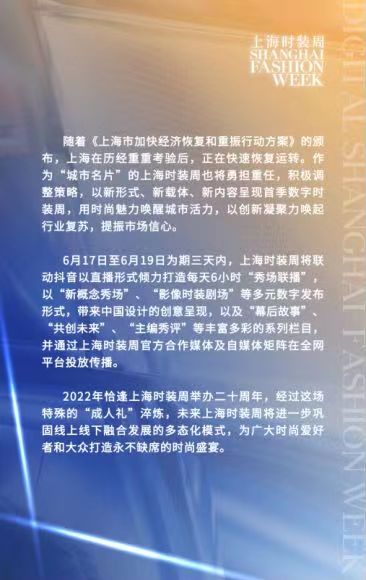 隨著《上海市加快經濟恢復和重振行動方案》的頒布,作為“城市名片”的上海時裝周宣布,將積極調整策略,以新形式、新載體、新內容呈現首季數字時裝周。6月17日至6月19日為期3天內,上海時裝周將聯動抖音,以直播形式,打造每天6小時“秀場聯播”,以“新概念秀場”“影像時裝劇場”等多元數字發布形式,帶來中國設計的創意呈現。