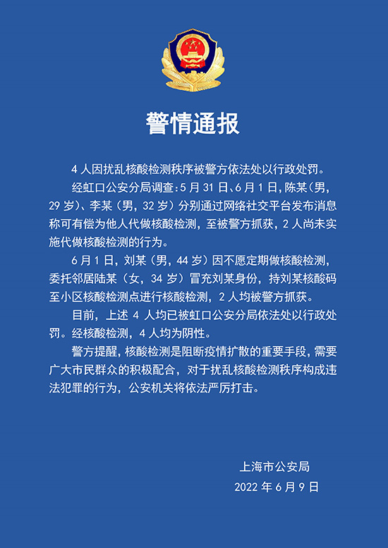 人民網上海6月9日電 (王文娟)據上海市公安局通報,4人因擾亂核酸檢測秩序被警方依法處以行政處罰。