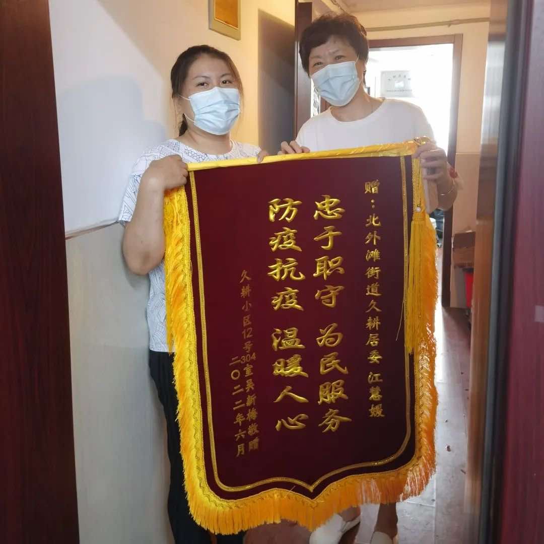 誰家的藥吃完了、下水道堵了、要就醫了,都第一時間想到江慧媛。她在小區內不停忙碌,兩個月下來,整個人都瘦了一圈。這些,居民們都看在眼里。吳阿姨一家、住在366弄12號的劉先生和15號的張阿姨都給小江送上了錦旗,感謝她在疫情期間點點滴滴的付出和幫助。