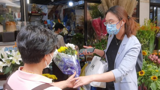 “市場挺人性化的,提前好幾天通知復市,前些天我們已經來整理和消毒了,并進了些蝴蝶蘭進行移盆造型!币ε康恼煞螯S先生向記者展示了他們這幾天的成果,店內兩層的花架上擺了十余盆姿態優美、花色典雅的蝴蝶蘭。蝴蝶蘭的下方是一桶桶鮮花,玫瑰、小雛菊、百合、芍藥、繡球……繁花似錦,花香沁鼻!磅r花都是今天早上來的,市場安排我們提前進來擺放!