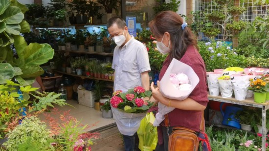 盡管是工作日,五彩斑斕的各式花卉也吸引了不少市民前來購買!爸笆袌龇饪,我就在網上團花了,現在他們復工了,當然要到店里來買!闭谔暨x芍藥的周女士一下子選了十二支芍藥,還買了百合、玫瑰,“看到這些含苞待放的花朵,感覺生活一下子鮮活起來了!