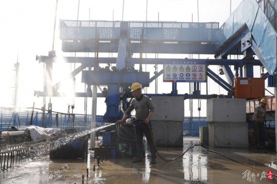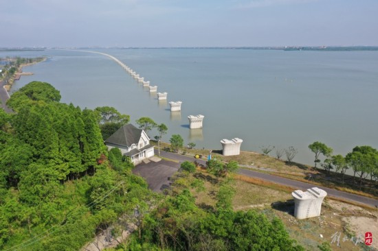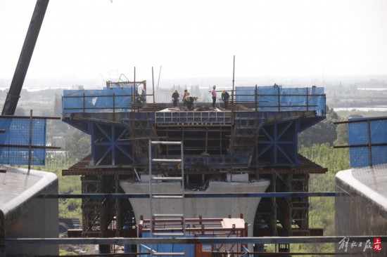 滬蘇湖高鐵青浦特大橋金澤橋段,是全線的控制性工程,全長1183米,單樁基就打下2581根,目前加緊進行懸灌梁澆筑施工,九月初完成合龍。
