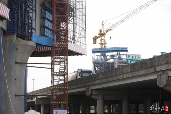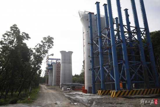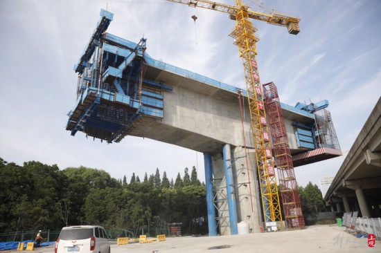 中鐵十四局負責承建該項目工程站前Ⅳ標段,在上海市青浦區金澤鎮范圍內有11.11公里,工程包含一處特大橋工程——青浦特大橋金澤橋段,全長1183米,橋段內所有墩身均已施工結束。 其中跨G50滬渝高速懸灌梁是全線的控制性工程,梁體全長為276.5m。該主梁共分為12段,從主墩0號塊施工向12號塊施工橫向延伸,最終兩側合龍。目前206#已施工完成5個節塊,207#已施工完成3個節塊,預計9月初施工結束。