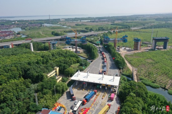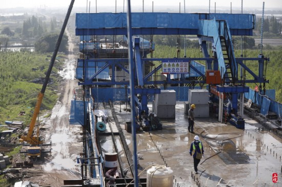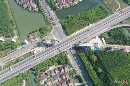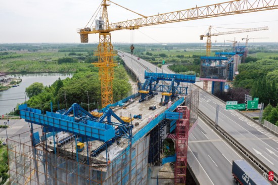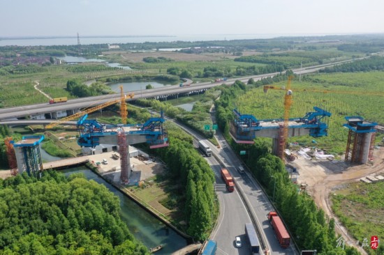 在青浦臨近吳江處,由中鐵十四局承建的全線控制性工程青浦特大橋金澤橋段,主跨跨越G50滬渝高速、邊跨跨越東航路的連續梁,以懸灌梁方式同時開啟相向澆筑施工。
