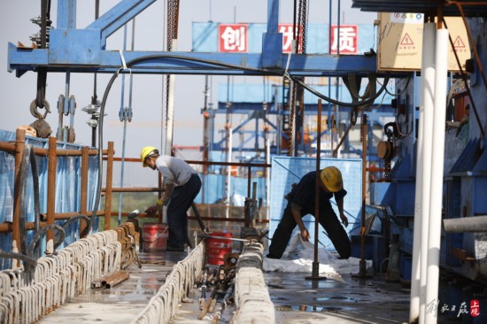 特大橋邊跨跨越東航路的連續梁同步施工。