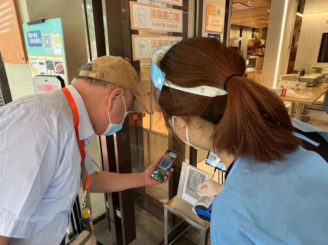 臨近上午11點,前來購餐的居民多了起來,其中以老年人居多。到店的居民在工作人員的提醒下,自覺在門口處排隊,保持兩米的安全距離。居民需要在門口進行體溫測量、掃描“場所碼”,待工作人員確認72小時內核酸陰性報告或持有24小時內核酸采樣證明且無其他異常后,方可上前進行點餐、取餐。