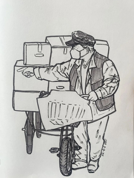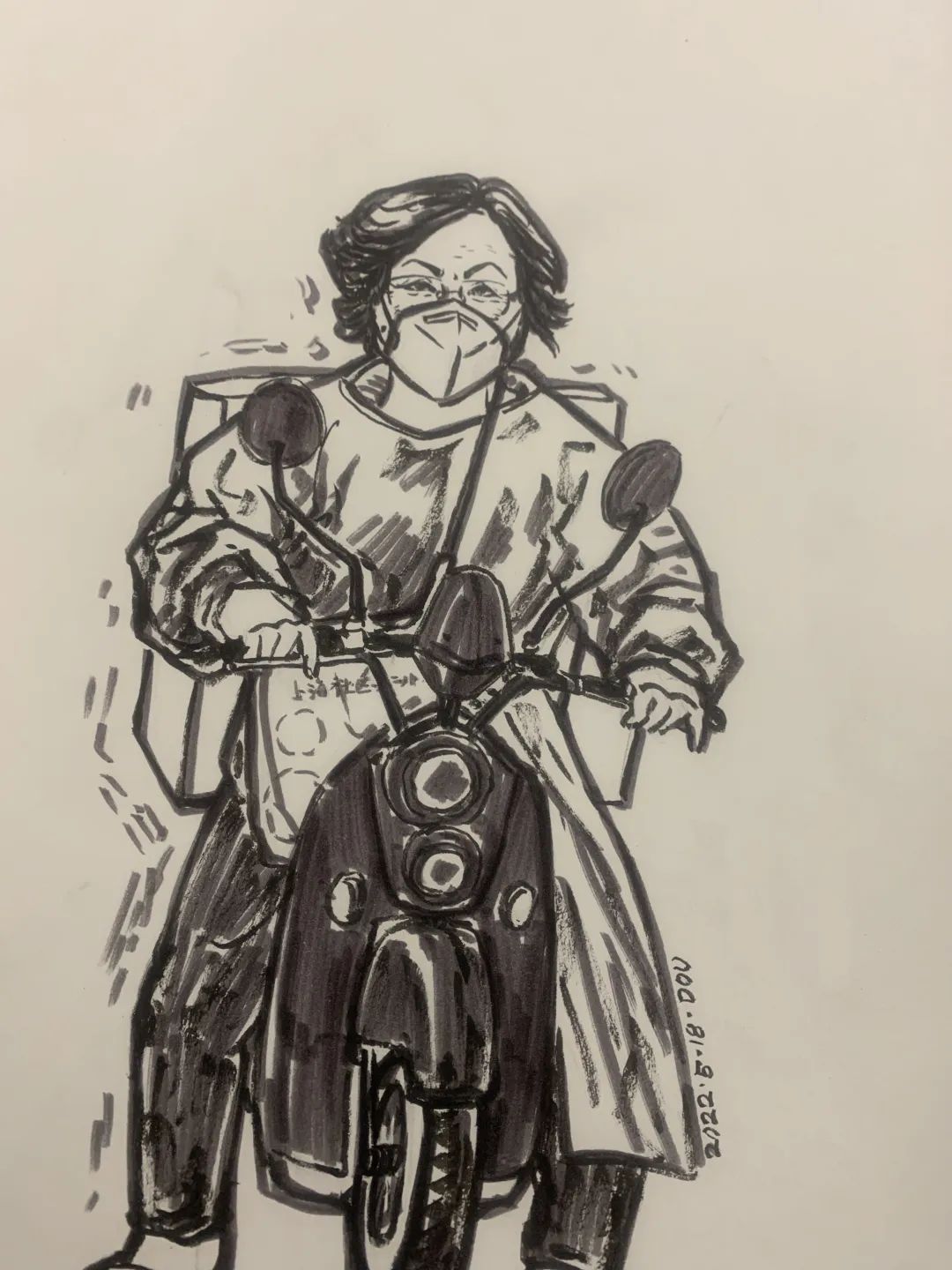 小區另一位居民劉豆豆則帶來了滿滿一本關于抗疫的人物速寫畫。翻開這邊畫冊,微卷短發三七開,鼻梁上架著一副眼鏡,戴著口罩、身覆反穿衣,肩膀上背著自制的斜挎包,騎著馱滿東西的“小電驢”!斑@個是沈書記!睆偷┚用駞^黨總支書記沈丹的形象躍然紙上,熟悉她的居民一眼就認了出來。