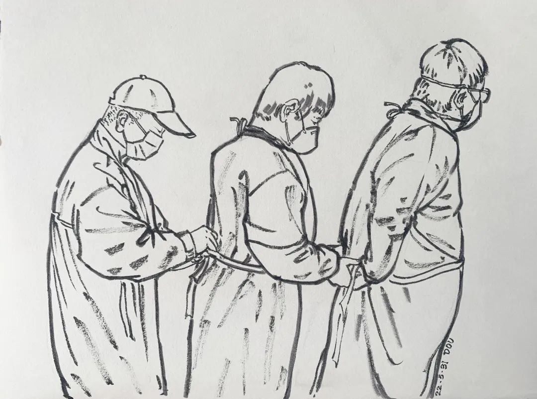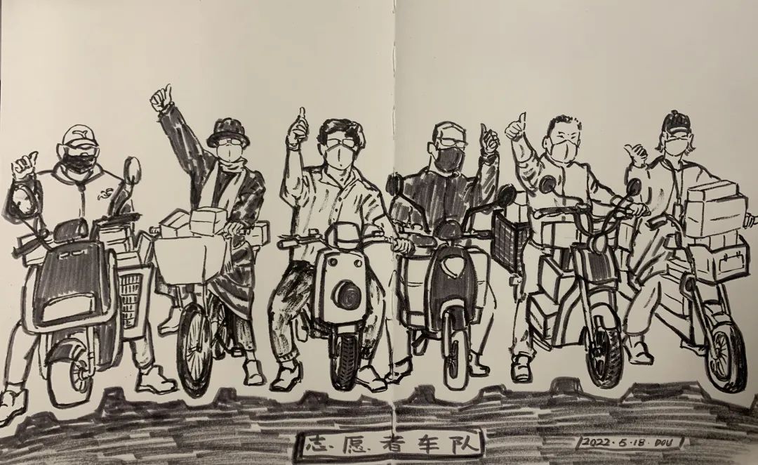 劉豆豆是上海工藝美術職業學院的老師。疫情期間,除了要照顧1歲多的孩子,她每天還有線上課任務,遺憾于自己不能加入志愿者隊伍,當看到小區微信公眾號中,熱心居民“懶蟲起床”拍攝的居委干部和志愿者忙碌的照片時,她萌生了創作速寫畫的念頭。