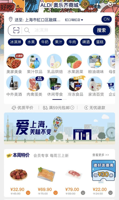 德國連鎖超市品牌奧樂齊(虹口瑞虹店),果蔬肉禽優質平價,烘焙類產品銷量很高,“奧家美食”品類匯聚各地特色,目前均可到店選購。