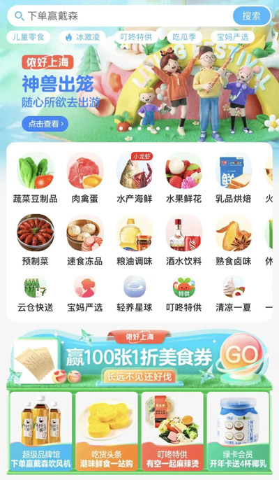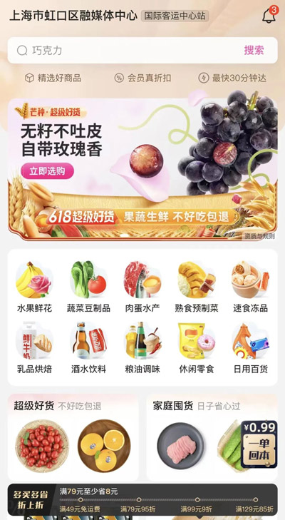 這些第三方平臺首頁有“超商便利”“蔬菜水果”等專區,可以直接在里面買到大小超市及菜市場(如華潤萬家、天貓小店、百果園等)的商品。