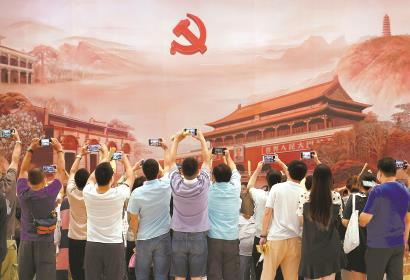 去年國慶節,人們在中共一大紀念館內參觀拍照。中共一大紀念館舉行升旗儀式、文藝表演等活動,為祖國慶生。新華社記者 劉穎 攝